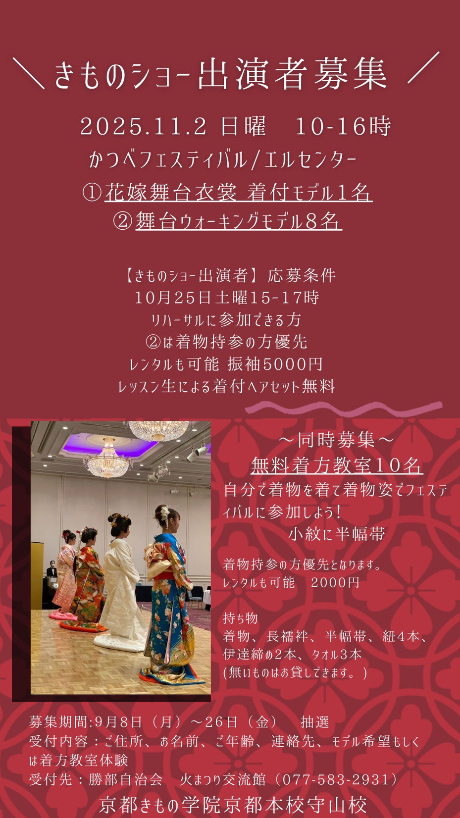 京都きもの学院さんのご協力で、きものを着てフェスティバルに参加したり、ステージを歩いてみたりなど、参加者を募集しています。